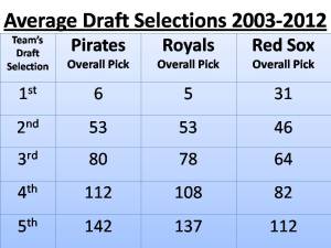 Conversely, the Boston Red Sox averaged 93 wins over the last decade and frequently shopped in the free agent and trade markets for Type A free agents, allowing many of them to walk after their contracts ended. Not surprisingly the Red Sox 1st pick in the annual draft averaged to be the 31st overall pick—resulting from a combination of the best/near-best win-loss record and forfeiting some first round picks due to signing free agents. However, after their first pick the patterns of draft selections gets interesting. The Red Sox second through fifth pick in the amateur draft was (on average) better than that of the Pirates or Royals. After choosing #31, the average Red Sox selections were #46, 64, 82, and 112. In each instance, picks two through five were better than those of the downtrodden Pirates and Royals. (See table below) In fact, over the last ten years, the Red Sox had a top 100 draft selection 41 times—meaning they averaged 4.1 per year from the top 100 overall picks. The Pirates had 31 (3.1 average) and the Royals had 33 (3.3), over the same 10-year period. Simply put, the draft pecking order had devolved into a reward mechanism for teams losing their free agents, rather than being driven by a team’s prior year performance.